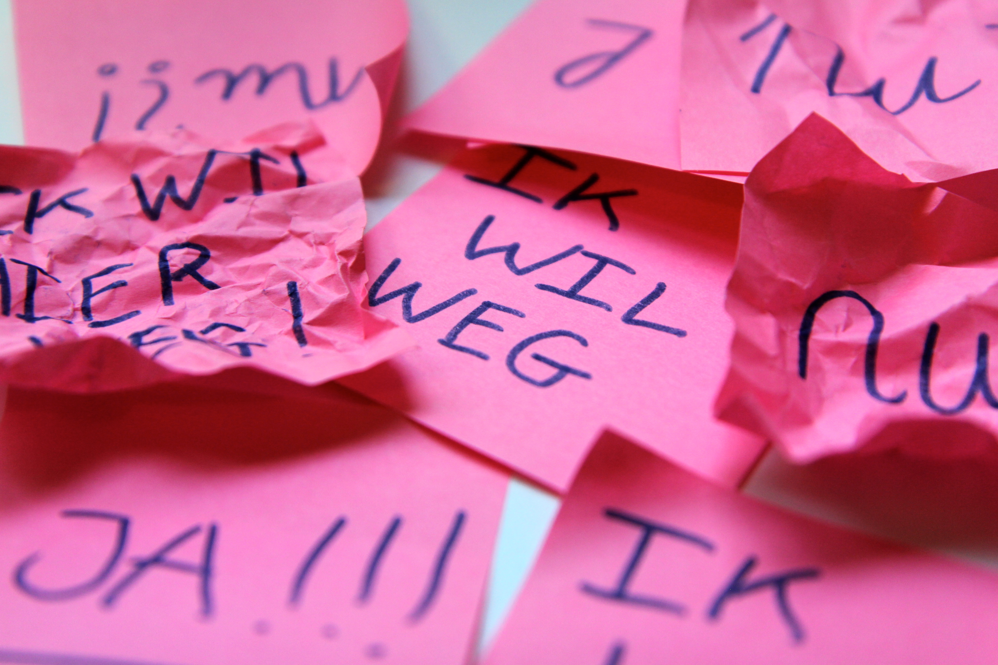 Maar nu weten jullie eigenlijk nog steeds niets. Laat het me verhelderen: het komt erop neer dat er behoorlijk last-minute nog een hoop aanpassingen gedaan moesten worden. Bepaalde beelden waren niet goed genoeg, anderen overbodig en weer anderen ontbraken, waardoor de boodschap van de video niet helemaal overkwam. De afgelopen twee dagen hebben we met z’n allen behoorlijk geïmproviseerd om in korte tijd nieuwe opnames te maken. Dit betekende backstage filmen bij de Effenaar, een hoop chaos tijdens een eerste lesuur (docent en klasgenoten: vriendelijk bedankt voor jullie medewerking) en gekneuter met roze post-it’s op mijn slaapkamertje. Zeker zestig procent van de originele beelden heeft de eindmontage niet gehaald. De beelden waarvoor we een hele dag bezig waren geweest. Kill your darlings, dat was van toepassing.