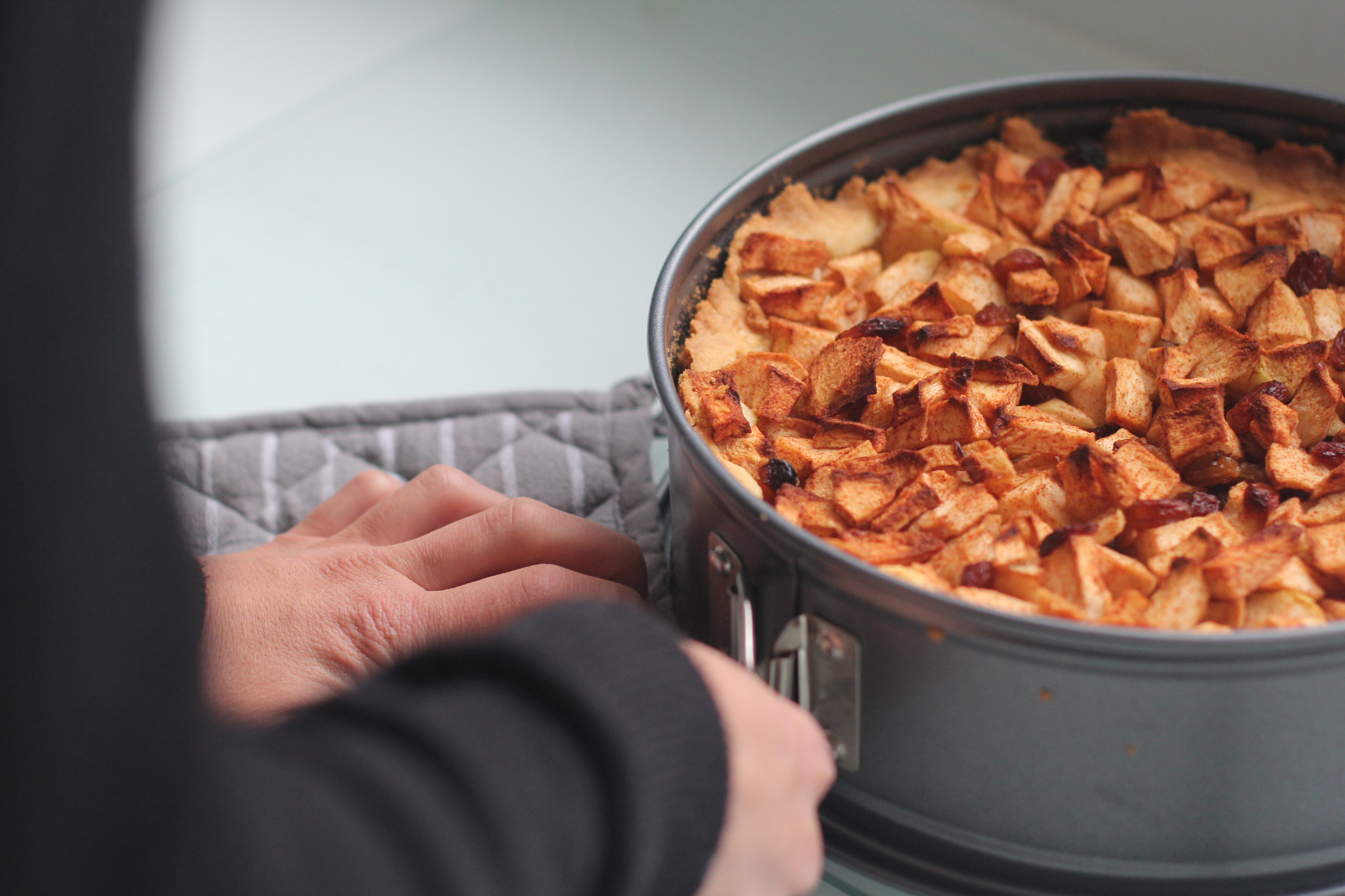 Het ging redelijk volgens plan, afgezien van het deeg dat nogal slap was, en dus moeilijk in de vorm te krijgen. Ik heb  het er maar als een bolletje ingeduwd, om het vervolgens in de goede vorm te boetseren. Dat bleek ook prima te werken. Ik denk wel dat ik hierbij mijn eigen krachten onderschat heb, want na een uurtje in de oven was de taart met geen mogelijkheid uit de vorm te krijgen. Na vijf minuten proberen hingen we hikkend van de lach boven het aanrecht. Dit was niet erg bevorderlijk voor het bevrijdingsproces van onze appeltaart.