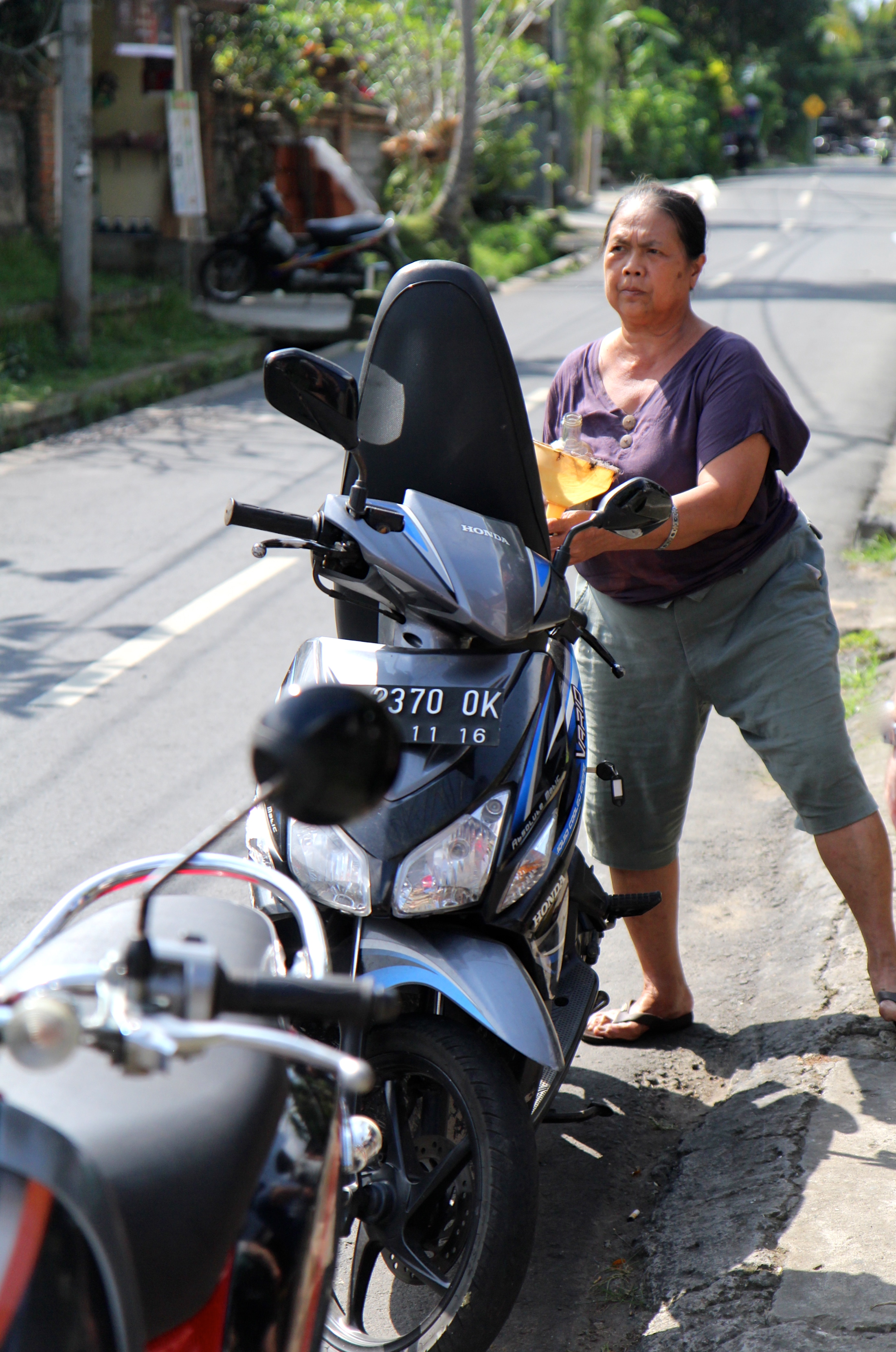 Deze meneer stond hoofdschuddend toe te kijken hoe onze scootertjes bijgevuld werden.