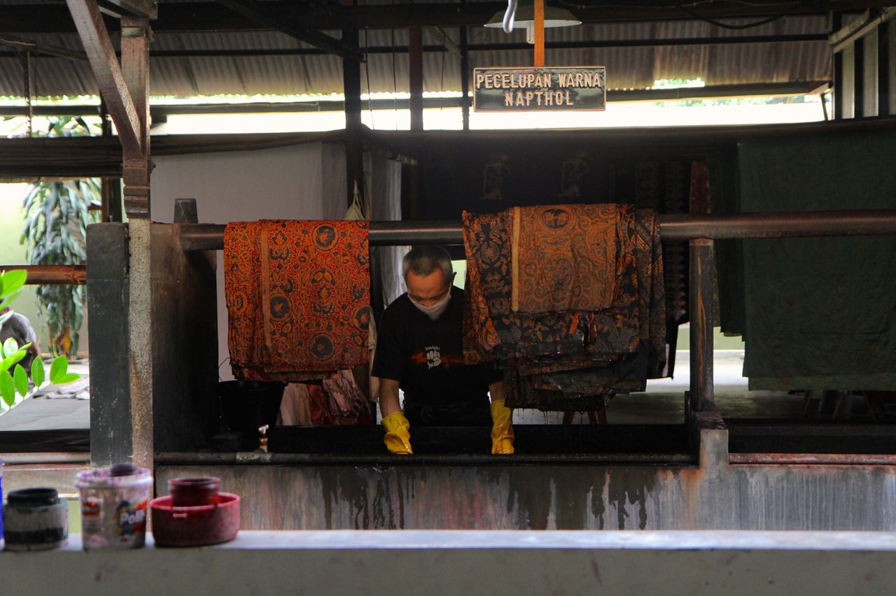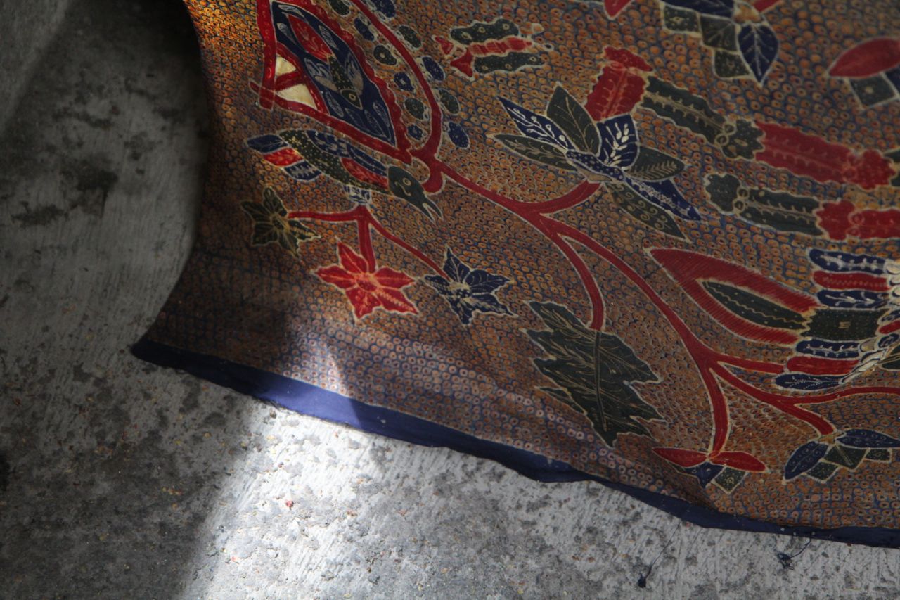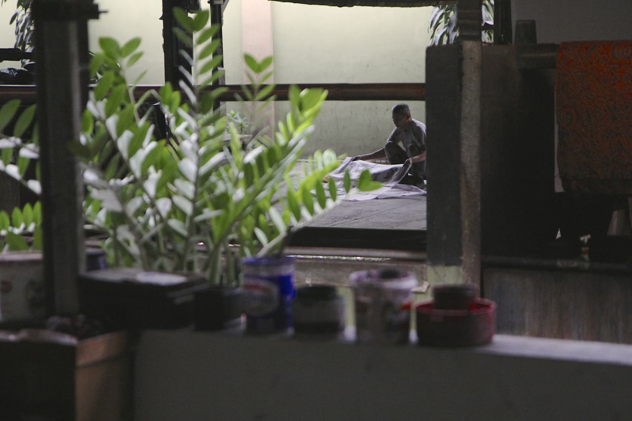 In de batikwerkplaats. De stof hierboven werd bedrukt met een soort stempels, anderen werden helemaal met de hand gedaan.