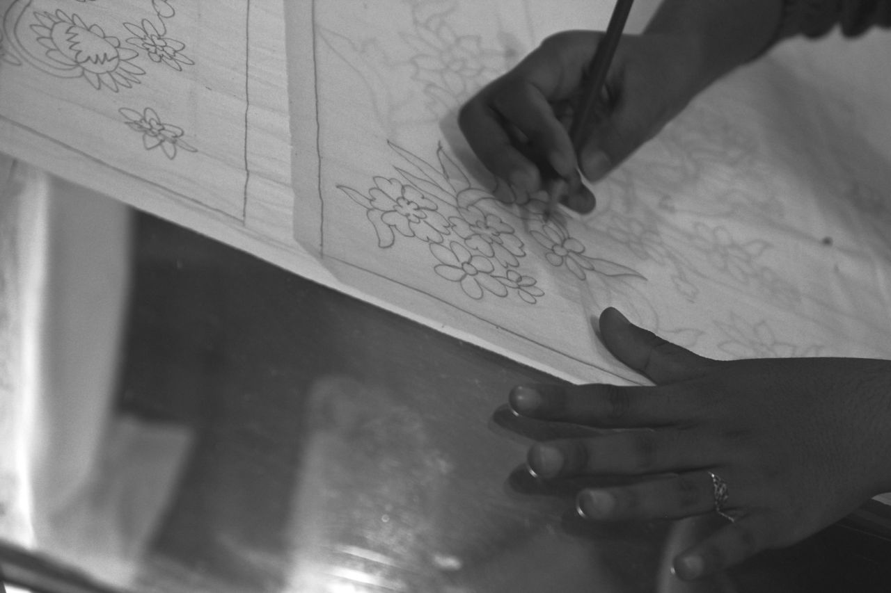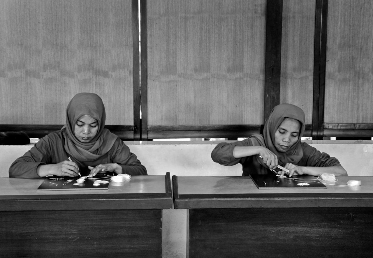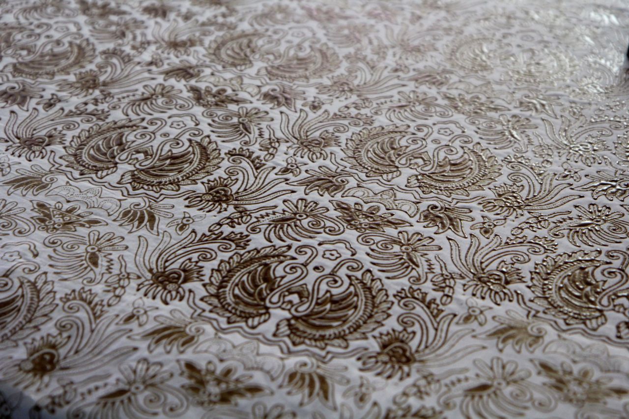 In de batikwerkplaats. De stof hierboven werd bedrukt met een soort stempels, anderen werden helemaal met de hand gedaan.