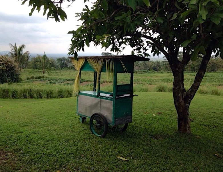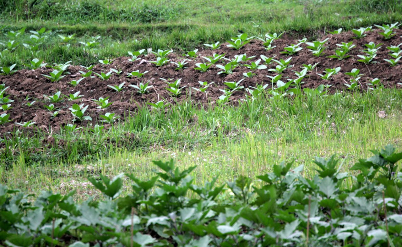 Het hotel keek uit over een rijstveld/groentetuin, waar af en toe iemand op z’n dooie akkertje wat stond te harken of spitten.
